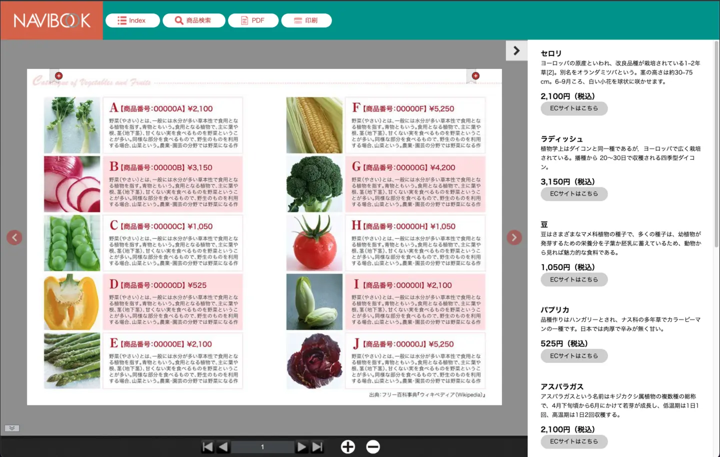カタログ紙面上の掲載商品を画面下部にリスト形式で一覧表示。各商品にURLを設定でき、外部のECサイトや特設ページへ誘導が可能。紙面内にポップアップで画像や動画、補足情報を表示することもできます。データベースを使用しないため、セキュリティや保守コストも最小限。Webサーバーにアップロードするだけで即運用が可能です。